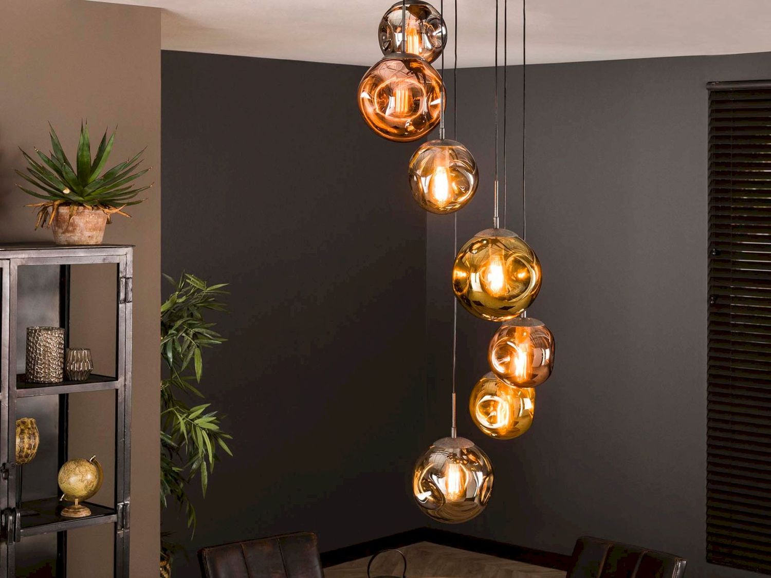 Diese schöne Hängelampe 'stellar' ist ein echter Blickfang! Die Leuchte ist aus Metall mit einem Glasschirm gefertigt. Die Lampenschirme sind in drei verschiedenen Farben erhältlich: Gold, Kupfer und Chrom.